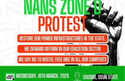 The National Association of Nigerian Students (NANS), Southwest Zone D has declared to embark on a massive protest over the current epileptics power supply, hike in...